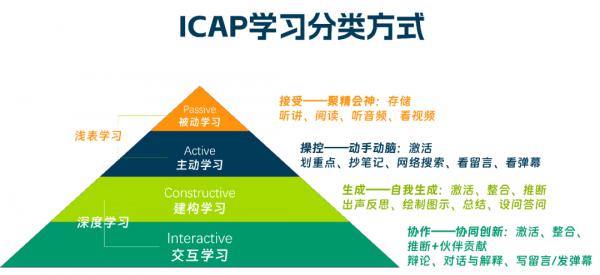 季清华是华裔学者,现为美国亚利桑那州立大学教授,认知科学专家。2014年提出ICAP学习方式分类,被誉为现代学习金字塔。该分类框架不属于对目标分类,但说明了不同的学习方式带来了 “认知过程”引发学习效果的差异。分为被动、主动、建构和交互四种学习方式[30]。如图9所示: