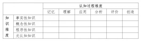 其最重要的改变是不再区分领域,而改用维度。即认知过程和知识两个维度。俗称新版布卢姆或2001版布卢姆分类法。是一个二维表格,如表1所示: